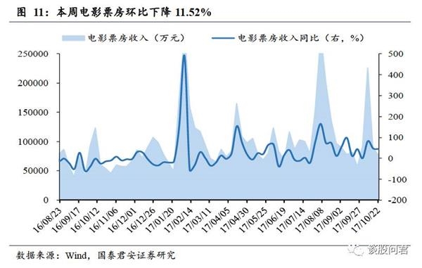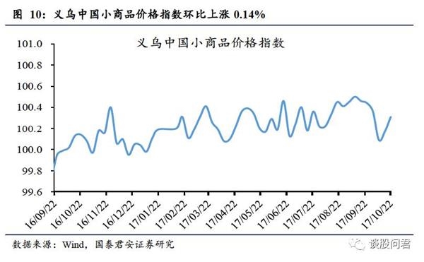 义乌小商品价格指数环比上升,电影票房环比下降。10月16日至10月22日,义乌小商品价格指数100.31,环比上涨0.14%,同比上涨0.17%。10月16日至10月22日,电影票房收入为7.82亿元,环比下降11.52%,同比上涨44.52%;观影人次为2306万人,环比下降13.11%,同比上升33.53%。