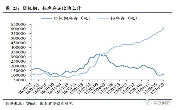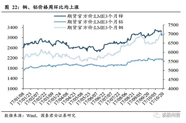 铜、铝价格环比上升,锌价格环比下跌。阴极铜库存上升。(1)截至10月20日,LME3个月铜期货价格环比上涨2.16%,LME铜现货价格较上周上涨2.19%;LME3个月铝期货价环比上涨0.25%,LME铝现货价格较上周上涨0.89%;LME3个月锌期货价环比下跌2.94%,LME锌现货价格较上周下跌3.52%。(2)库存方面,截至10月20日,本周阴极铜库存较上周环比上涨8.08%(上周环比上涨1.06%),铝库存较上周上升5.70%(上周环比上升3.43%),锌库存较上周下降0.46%(上周环比上升5.56%).