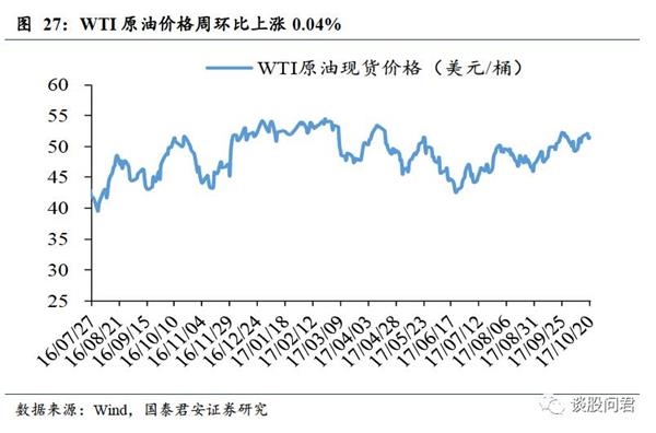工业整体平稳,宏观经济有韧性。高炉开工率持平,发电力度下滑,螺纹钢价格下降,煤价持平。地产政策继续收紧下,商品房销售持续降温,而销售与投资间存在时滞,9月地产开发投资增速回升,此外汽车行业整体向好,宏观经济有韧性。(1)下游:地产整体销售本周环比上升,同比持续下滑,住宅类土地成交面积累计同比上升;10月车市零售走势良好;义乌小商品价格指数环比上升,电影票房环比下降;猪肉环比下跌,鸡肉、蔬菜价格环比上升。(2)中游:高炉开工率环比持平,6大发电集团日均耗煤环比下降,发电力度下降;螺纹钢价格环比下降;水泥价格和玻璃价格均上涨;(3)上游:动力煤期货价格环比上升,焦炭、焦煤期货价格环比下跌;铜、铝价格环比上升,锌价格环比下跌;海运指数BDI、BPI、BCI均环比上升。特朗普税收改革取得重大进展,市场对通货膨胀的预期提高,加上美联储继任主席很有可能是鹰派经济学家,美元指数上涨0.67%。受美元走强影响,黄金价格环比下跌1.87%。