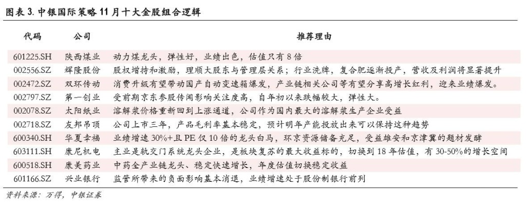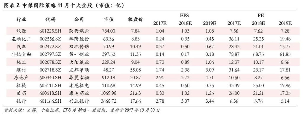 乳制品和调味品优势企业18年向上弹性高。消费习惯和营销模式改变,可推动品牌白酒17-18年收入增20%以上。继续推荐伊利股份、中炬高新、山西汾酒、贵州茅台、五粮液。未来2个月是业绩真空期,同时18年春节较晚,因此11月可适当关注前期涨幅较低,且存在改善预期的品种,如古越龙山、好想你等。
