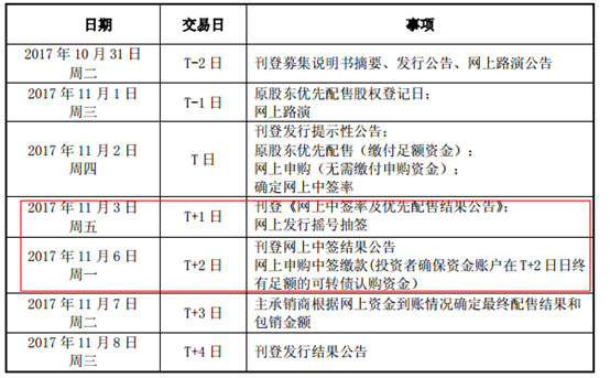 T+2日(11月6日),公布中签结果,中签用户,要确保你们的资金账户这天有足额的认购资金,不足部分视为放弃认购。
