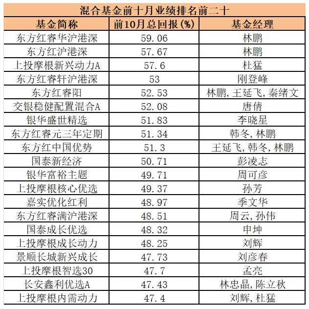 东方红旗下基金10月份占据混合型基金前五名中的4席位。东证资管公募投资总监林鹏管理的东方红睿华沪港深、东方红沪港深基金霸占混合型基金业绩排名第一和二位,除此之外,东证资管另一位基金经理刚登峰独自管理的东方红睿轩沪港深也排在混合型基金业绩第五,林鹏与王延飞、秦绪文共同管理的东方红睿阳也是前10月排名前五的基金之一。