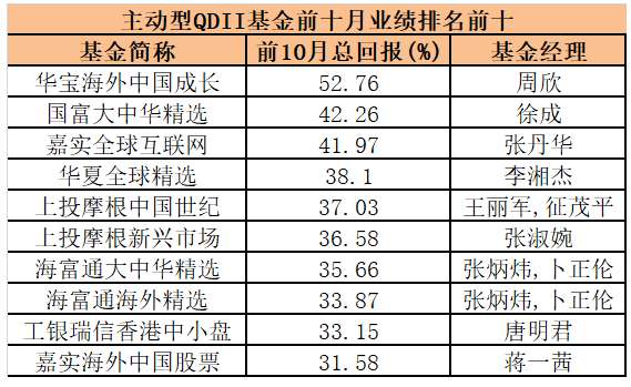 除了华宝海外中国成长,嘉实全球互联网、国富大中华精选2只QDII基金前十月涨幅也超过40%。
