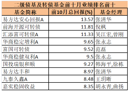 易方达安心回报A也依旧排在前十月二级债基及可转债基金业绩榜单第一位,作为一只二级债基,今年前三季度,易方达安心回报凭借海康威视等个股的良好表现,对冲债市调整对基金净值的不利影响,前三季度涨幅超过10%,10月以来,债市持续调整,该基金净值在三季度基础上仍继续上涨,截至10月末净值上涨13.56%。汇添富可转债A、富国可转债等部分可转债基金在10月末也新进二级债基及可转债基金前十名榜单。