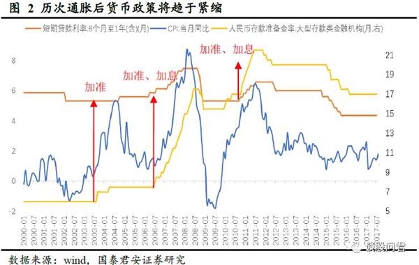 不过站在现在的时点,我们认为,2002年以后的数次持续通胀前都有M2同比增速扩大,货币供应量在2014年以来的快速上升,前期并未影响实体物价水平,伴随金融去杠杆的深入引导资金脱虚向实,同时伴随经济回暖,广义社融增速开始回升;供给侧改革以来PPI的回升,也开始逐步标志着市场出清开始出现;本年以来消费板块的良好业绩和消费升级的市场共识,也表明了房地产财富效应后,终端消费开始呈现出了承接能力。历史经验告诉我们,PPI向CPI传导可能存在时滞,但大概率会发生。