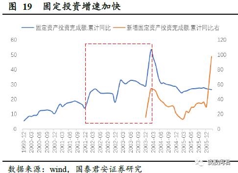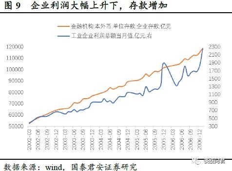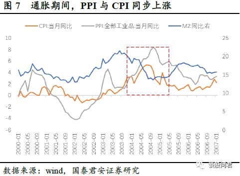 2001年末,中国加入WTO,叠加全球经济复苏,投资需求和消费需求均显著提升,直接作用于PPI和CPI,在我们划分的通胀区间2003.11-2005.04之中,CPI同比突破3%,最高达5.3%,PPI与CPI表现为同步上涨。在2002年前后,货币政策并未明显宽松,M2增速的上涨来源于外需拉动下,出口额增长所带来的外汇占款增加以及企业盈利大幅上升所带来的存款增加。