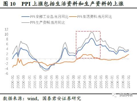 我们进一步观察下游的消费需求(社会零售总额同比增长)会发现,CPI逆向传导至PPI的路径为:下游需求旺盛(社会零售总额同比增速上升),消费品价格上涨,从而形成卖方市场,使得PPI中的生活资料一般日用品上涨,进而带动消费品的生产上游上涨。我们认为,这可能是在经历了05-07年高增长、低通胀时期后,企业、居民部门的财富增加导致。同时,房地产固定投资增速上行,投资需求保证了PPI的上升具有持续性。