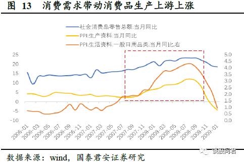 流入实体的货币量增多与房地产固定投资增速快速上行,共同直接导致了PPI的上升。而下游的消费需求稳定也保证了PPI上涨后,终端商品仍然有能力消化成本的上升,CPI能够持续地上涨。