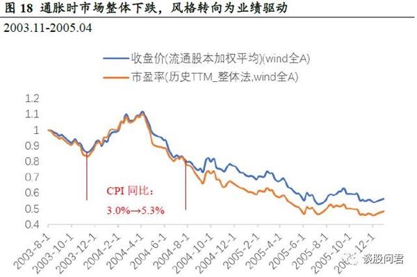 三次通胀时期,市场整体在经历短暂上涨后,在剩余时间均保持下跌的趋势,历史经验表明,在三次通胀时期,估值水平的下降幅度大于股票价格的下滑,这意味着估值水平下降,但上市公司业绩整体上升。这背后的逻辑是:通货膨胀有利于企业价格提升从而改善盈利,同时通货膨胀让投资者对于股票、债券等资产的回报率要求提高,价格转向为分子端的业绩驱动。一般经典理论认为,温和通胀是股票商品牛市,而高通货膨胀是股票商品的熊市,我们认为三次通胀区间分别在(3.0%-5.3%),6.5%-8.7%,4.9%-6.5%,都是介于温和通胀和高通货膨胀之间的水平,而历次通胀都对货币随后的政策形成了制约,因而市场整体震荡下行,但幅度有限。