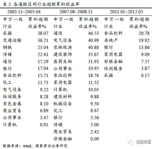 我们发现在三次通胀期间,银行业平均获得近15%的累计超额收益。主要原因在于,通胀预期增加,居民、企业存款活期化速度加快;同时投资需求增加使得银行新增贷款需求增加,两者共同推动银行业净息差增加,带动银行业股价上涨。
