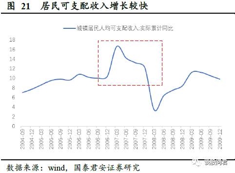 (2)2007.08~2008.11,CPI带动PPI,需求主导型通胀。经历了前几年的经济持续增长和低通胀,居民可支配收入增长,消费能力增强,由强劲的消费需求从下游向上传导,消费板块和中游制造业首先受益,业绩优异,相对收益领先。