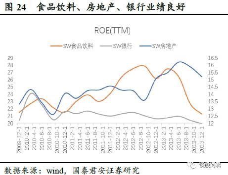 (3)2011.01-2012.05,“四万亿”和信贷扩张推动房地产投资增速加快,房屋竣工和待售面积在2011年底达到高位后持续降低,导致价格持续抬升,房地产行业获得不错业绩。通胀期间食品饮料行业作为必选消费品,业绩增长较快。银行业在整个通胀期间获得稳定业绩。