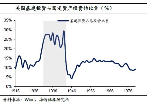 历史上美国也曾经历过基建投资高速增长的时期。1929年,大萧条破坏了美国市场经济的动能,为了刺激经济复苏,时任美国总统罗斯福推行大规模的基础设施建设。1933年-1945年间,美国基建投资占固定资产投资的比重一直处于20%以上,大部分时间还超过了25%。从细分项来看,美国当时的基建投资主要投向了道路建设和环保发展。基础设施的大规模投资使得美国当时拥有世界上最好的公路系统。
