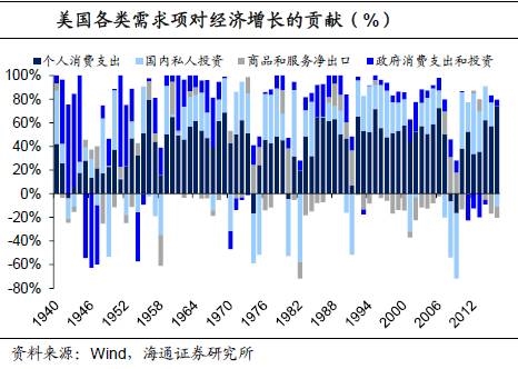 基建下滑没有影响美国经济增长,主要是因为美国成功转型摆脱了对基建投资的依赖。从需求端来看,美国经济其实早已转变为依靠私人消费和投资拉动的增长模式。上世纪40-50年代,美国的经济主要与政府支出相关,政府支出对经济增长的贡献率一度超过100%。而50年代之后,美国的私人消费对经济的贡献率持续增长,经济的波动与私人消费和投资之间的关系更为紧密。