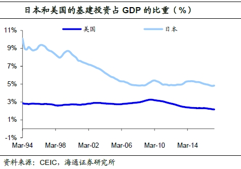 与美国不同的是,日本目前还没有摆脱基建投资的拉动,并且经济持续低迷。尽管日本基建投资占GDP的比重已经从高位回落,但是目前也仍在4.8%,接近美国的历史最高水平。而基建投资并没有带动经济强劲增长,日本GDP增速一直处于低位。