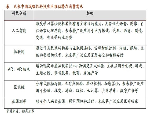 招商证券解释称,在全球消费升级的大趋势下,技术革命迅速转化为消费品,并反过来推动技术继续进步。科技突破会刺激不同行业新兴消费需求,黑科技革新传统产品,如电子、通信、家用电器(手机、共享单车、智能家居);创新辅助手段和构建移动平台,如传媒(游戏、电影)、商业贸易(电商)(移动平台),以及医疗器械、生物制药(医疗美容)。科技进步为社会提供丰富物质产品与娱乐方式,促使需求落地。