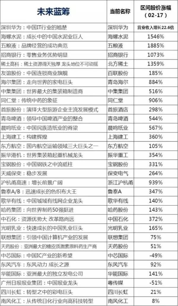 《未来蓝筹》的目录上共出现了30个行业和对应的30家被推荐的公司,其中唯一没有上市的是华为,当年它的实力就已经超过中兴通讯,如今,它依然是电子通讯行业当之无愧的龙头。如2002华为的营业收入为221亿,到2016年就达到了5216亿,增长2260%。