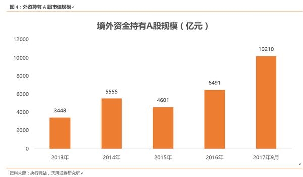 先看一组非常具有代表性的数据,2016年年底,根据央行的数据,外资持有A股的规模为6500亿人民币,而短短三个季度之后,2017年9月,这一数字已经达到1.02万亿,不到一年时间海外资金规模大幅增长3500亿。