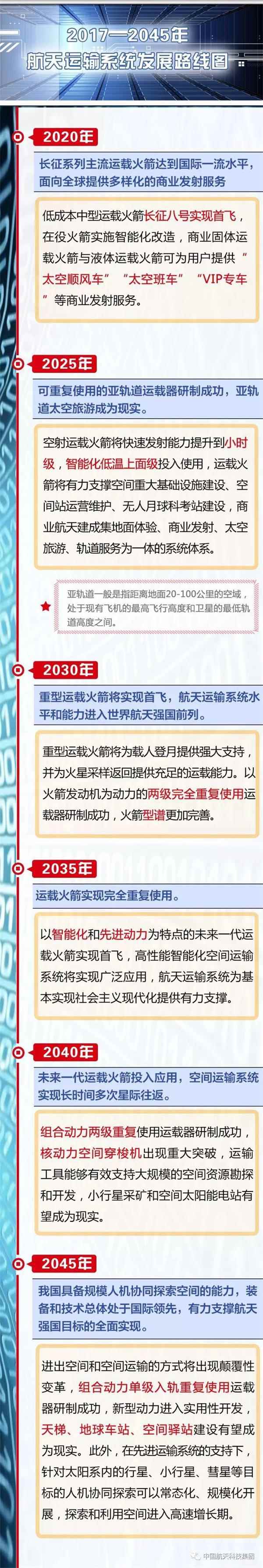 到2025年前后,我国可重复使用的亚轨道运载器研制成功,亚轨道太空旅游成为现实。亚轨道一般是指距离地面20-100公里的空域,处于现有飞机的最高飞行高度和卫星的最低轨道高度之间。