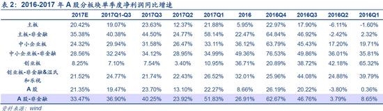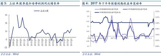 自2016Q3以来,A股净利润单季度同比增长率维持在较高水平(平均在20%左右),利率或有负面影响大概率被抵消。其中,在2017Q3全A单季度盈利增速为23.70%,整体超预期,持续创新高。具体来看,按照可比口径计算得出全AQ3净利润同比增速为19.47%,单季净利润同比增速为23.70%,较Q2的同比增长13.10%明显上升。剔除金融后,全AQ3单季净利润同比增速为40.25%,较Q2的同比增长23.92%大幅提升。其中,金融行业稳中向好以及上中游资源品如采掘、有色、钢铁行业的高增长是上市公司业绩增长的主要来源。同期,一年期国债收益率变动幅度稳定在0.08%左右;5年期和10年期国债收益率变动幅度较大,平均变动率分别为2.49%和2.43%。
