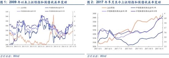 2017年5月份以来,10年期国债收益率一路震荡上行,自3.5%左右升至11月14日一度破4%,引发市场投资者广泛关注。一般而言,10年期国债收益率能反映一个经济体广义金融市场的无风险收益率水平,其持续快速上升对股票等风险资产的估值往往构成明显压力。但是,2017年5月以来上证综指从3100点左右一路升至逾3400点,似乎并没有受到债市持续走低的传染,本文将就此进一步探讨其背后的原因。