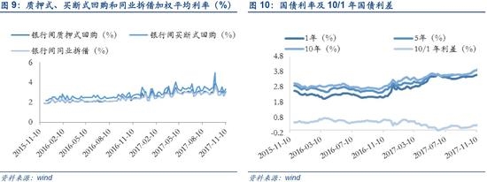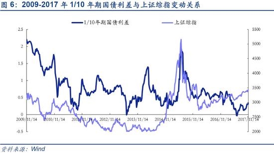 国债利率和利差双上升或暗示经济向好,抬升估值中枢。今年三季度GDP同比增长6.8%,前三季度GDP同比增长6.9%,经济连续9个季度运行在6.7%-6.9%的区间,工业、服务业、房地产投资企业利润指标指标不断走高,中国经济发展韧性接连超预期。同时,受近期供给侧影响,市场预期2018年需求回暖将带动供需矛盾加剧,商品价格或将进一步提升,通胀预期再启叠加海外加息预期,市场认为2018年经济并不悲观,基本面持续复苏对利率形成向上支撑同时抬升股票估值中枢。值得注意的是回顾历史我们可以发现,通常在流动性偏紧致使短期收益率上升幅度大于长期、息差收窄、收益率曲线趋于平缓的情况下,股市通常会随债市调整而走低;当息差上行时,债市走低通常是资金在通胀预期抬升的背景下进行资产再配置,短时期内对股市走向影响有限。目前来看,2017年下半年来十年期国债收益率快速上升的同时短端一年期收益率上升并不多,1/10年期国债利差呈震荡走高状态,债市收益率曲线陡峭化预示市场对于经济复苏、通胀上升的预期增强。