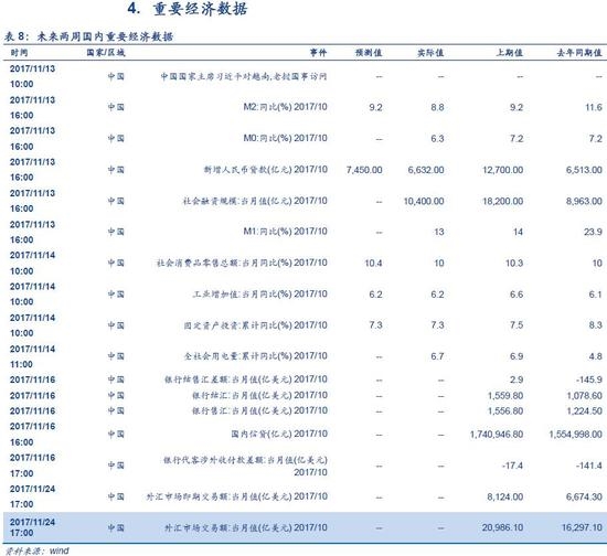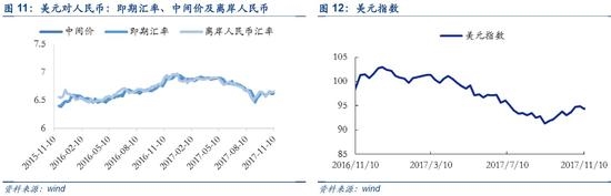 解读:上周美元指数转为下跌,人民币继续贬值。受到英国GDP预测增速高于前值,美国税改延迟不确定性拖累以及美债收益率逼近三周低位,美元指数出现一个月来首次周线下滑。我们预计若本周税改争议延续,美元指数将仍有走低空间。上周人民币即期汇率、币中间价、离岸汇率和1年期NDF齐齐走高,预计在四季度企业用汇需求大、年初个人购汇额度将重置引发购汇需求提前释放情况下,四季度外汇供求压力加大,人民币兑美元汇率在保持双向波动大格局的同时大概率易跌难涨。
