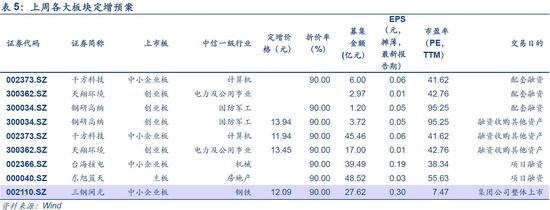 一级市场方面,上周共有9家公司完成IPO网上发行,募集资金共95.53亿元;本周共3家公司完成IPO网上发行,预计募集资金共13.27亿元,较上周下降86.11%。上周共9家公司公布定增预案,预计募集资金共191.98亿元,较上上周同比下降74.02%。