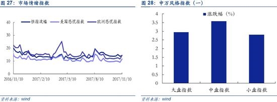 国际市场方面:上周围绕美国税改或将推迟的新闻引发金融市场巨震,美国三大基准股指大跌,恐慌指数一度飙升22%,创两个月以来最大升幅,市场观望情绪或将进一步延续。美国税改争议引发的市场情绪变化也进一步波及到欧洲市场,叠加欧元兑美元汇率受经济提振大涨影响,欧洲三大股指连续六个交易日走低,欧洲恐慌指数上周上升2.89至14.45,预计在欧洲经济日益复苏情况下,欧洲市场情绪将有一定好转,恐慌指数大概率转为下跌。