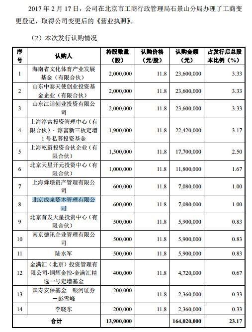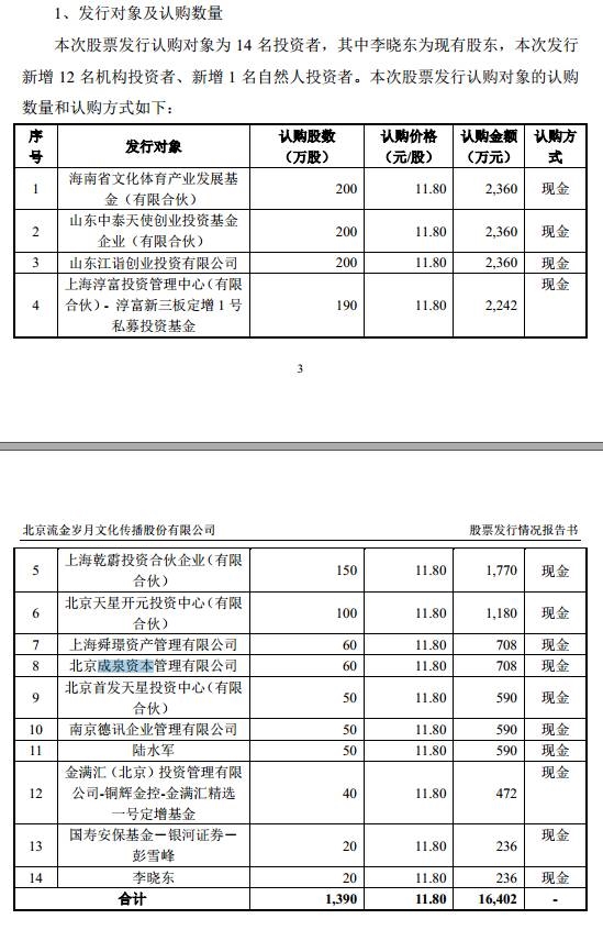 公告称,本次股票发行认购对象为 14 名投资者,其中李晓东为现有股东,本次发行新增12 名机构投资者、 新增 1 名自然人投资者。而这次发行的新增的机构投资者中就有北京成泉资本。其此次认购 60万股 ,发行价格为11.80元每股,共花费708万元现金。根据公开资料,成泉资本没有新三板基金,也就是说,708万现金是公司账户上的自有资金。花费数百万投入一家新三板公司,说明了成泉资本对流金岁月的青睐。