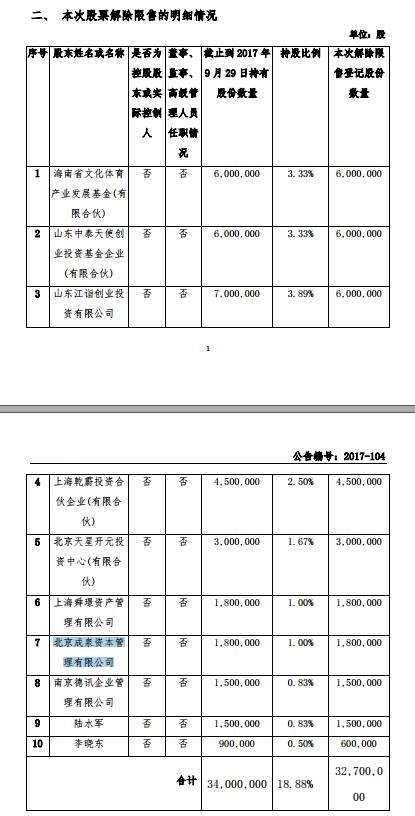 而在公告《北京流金岁月文化传播股份有限公司股票解除限售公告》中称,本批次股票解除限售数量总额为 32,700,000 股,占公司总股本的比例是18.17%, 可转让时间为 2017 年10 月 31 日。同时披露了截止9月29日,成泉资本的持股情况,跟此前一样。
