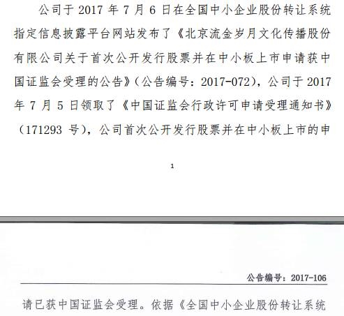 在11月13日,公告《流金岁月:关于股票停牌进展公告》中称,公司股票自 2017 年 7 月4 日起暂停转让,目前还在停牌中。而公司在中小板IPO的申请已经得到了证监会的受理。