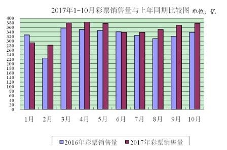 10月份,全国共销售彩票376.53亿元,比上年同期(简称“同比”)增加38.26亿元,增长11.3%。其中,福利彩票机构销售183.12亿元,同比增加10.05亿元,增长5.8%;体育彩票机构销售193.41亿元,同比增加28.21亿元,增长17.1%。