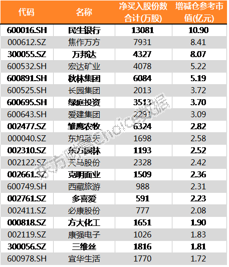 其中11月以来增持金额最多的是民生银行增持超过10亿元,此外,焦作万方、万邦达等均增持金额均超过5亿元。