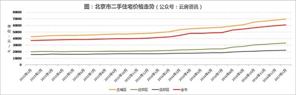 据云房数据研究中心统计,2017年1月北京市二手住宅价格为60845元/㎡,环比上涨2.21%。其中,主城区二手住宅价格为69726元/㎡,环比上涨2.11%;近郊区二手住宅价格为33236元/㎡,环比上涨2.80%;远郊区二手住宅价格为22414元/㎡,环比上涨2.63%。