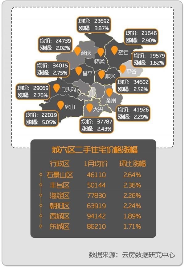 据云房数据研究中心统计,1月份房山城关(房山区)的二手住宅价格涨幅最大,为7.75%;陶然亭(西城区)以5.59%的价格涨幅位列第二,后沙峪(顺义区)排名第三,环比涨幅为4.54%。价格涨幅较大的片区主要集中在房山、朝阳、丰台等地。
