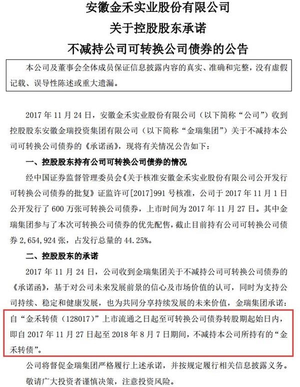 不过,在金禾转债上市前夜,金禾实业发布了《关于控股股东承诺不减持公司可转换公司债券的公告》,公告中提到: