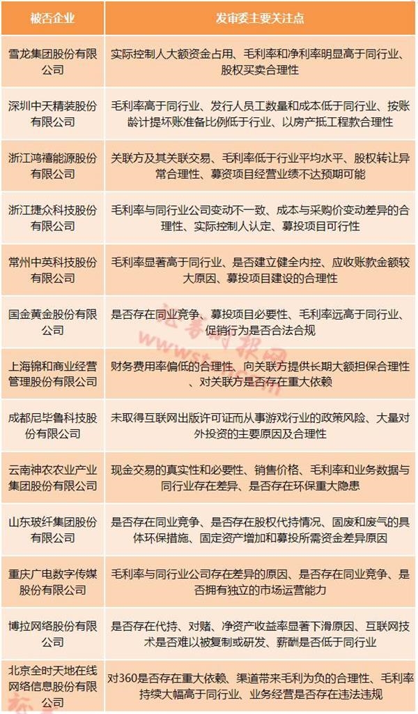 从近期被否的十多家企业的情况来看,毛利率异常极大概率被否,十有八九被否企业中都涉及毛利率与同行业上市公司存在明显异常的情况,同时,关联交易、募集资金运用、重大不利状况是否会导致持续盈利受影响、财务和业务的规范性、同业竞争、是否符合现有法律法规要求、是否存在股权代持等7个方面,都是发审委的关注重点。