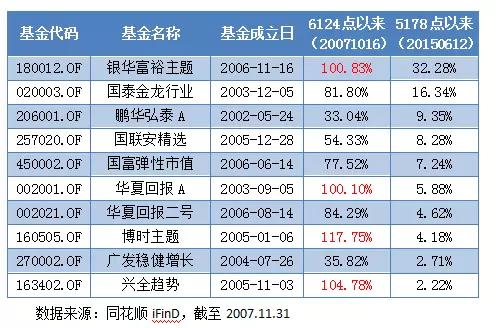 在成立时间十年以上的主动偏股型基金中,2015年6月12日(5178点)以来取得正收益的有12只,这12只基金中,2007年10月16日(6124点)以来回报率30%以上的正好十只,其中,银华富裕主题、华夏回报、华夏回报二号、兴全趋势这四只基金十年以来的回报率超过100%。而且这些基金都有一个特点,在任何高点买入,都是能赚钱的。