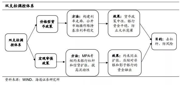 央行逐渐确立了货币政策和宏观审慎政策的“双支柱”调控框架。一方面,央行公开市场操作更加精细化,通过利率走廊引导DR007利率,维持DR007与R007利差,倒逼表外去杠杆。另一方面,宏观审慎政策则作为货币政策的有效补充,通过MPA考核抑制同业业务和表外业务的无序扩张,降低非银和影子银行的杠杆率。而未来双支柱框架在疏通利率传导路径、补充MPA考核框架(将更多金融活动、金融市场、金融机构和金融基础设施纳入MPA覆盖范围)和加强政策协调方面或将继续完善。
