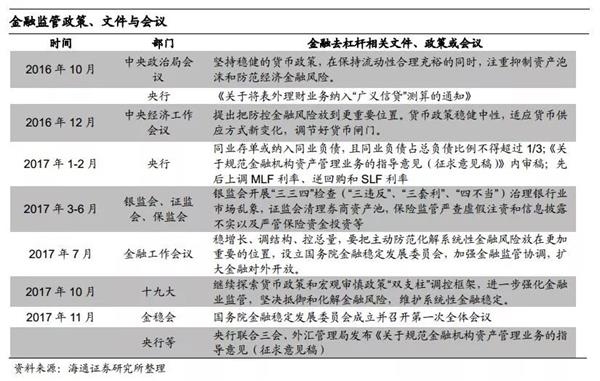 金融监管趋严,监管协调加强。本轮金融去杠杆始于16年下半年,央行锁短放长并提出将表外理财纳入MPA考核,中央经济工作会议指出货币政策稳健中性,调节好货币闸门。进入17年金融监管协调加强,上半年央行上调公开市场操作利率,“三会”均出台针对性的金融监管措施;下半年的金融工作会议、十九大均表示加强金融监管协调,11月国务院金稳会成立、央行联合三会和外管局发布资管新规。