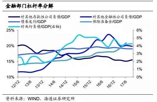 金融部门杠杆走稳。金融部门非存款负债与GDP的比值在16年创新高,达到131%,我们估算17年中仍维持在131%左右的水平,与16年相比或维持平稳。杠杆率走稳主因银行对银行杠杆、银行对非银杠杆和债券发行杠杆趋于下滑,体现为同业存单发行量减小并逐渐转负、同业理财规模收缩等。
