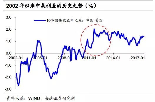 但我们认为中美利差应该缩窄。理由是中美利差120bp并非常态,过去的10年是美国货币超级宽松的十年。而在2010年以前的10年(2002-2010年),在美国正常的利率环境中,中美利差甚至是倒挂-50bp。最本质的原因在于,美国的GDP增速虽低,但是企业的利润率并不低,而中国的GDP增速虽高,但企业的利润率并不高。