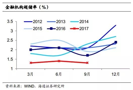 金融机构层面乘数依然高企。我们以其他存款性公司总资产与基础货币余额之比来衡量金融机构的信用扩张,14年末该比值接近6,到了17年7月突破8倍,但9月出现年内首次下滑,未来能否趋稳甚至下滑,值得关注。