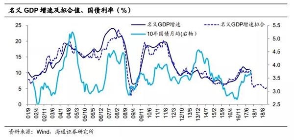名义GDP角度。从拐点来看,名义GDP在17年中出现拐点,但由于金融监管政策的影响,国债利率依然上行。从绝对利率水平来看,10%~12%的名义GDP增速对应的十年期国债利率均值3.5%,而17年四季度以来国债利率一度破4、远超历史均值。从我们根据工业增加值、CPI和PPI拟合的名义GDP增速来看,18年名义GDP增速将明显下行,这意味着当前3.9%~4.0%的十年国债利率处于顶部区域并明显超调。