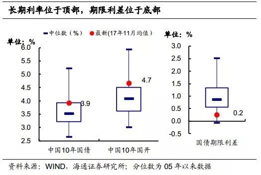 期限利差角度。过去5年,我国10年国债收益率与R007利差均值为20bp.2013年钱荒时期,期限利差全年均值为-28bp,曲线一度倒挂显著。14-16年随着资金利率下行,期限利差均值为40bp左右。我们预计18年R007中枢在3.3%左右,期限利差若为20-40bp,那么对应10年国债收益率区间在3.5%-3.8%左右。