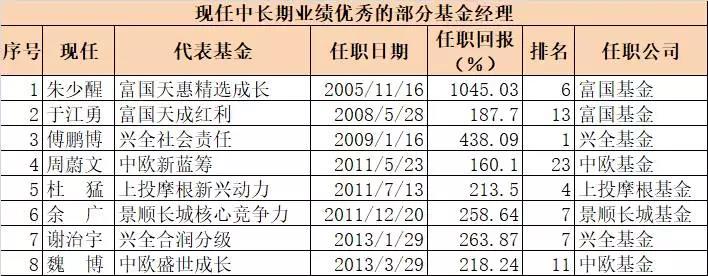 而在现任基金经理中,也不乏长跑健将,除了富国基金朱少醒,还包括富国基金于江勇、兴全基金傅鹏博和谢治宇、中欧基金周蔚文和魏博、景顺长城基金余广、上投摩根基金杜猛等。近年来也涌现出不少的投资新星,他们的未来表现值得期待。