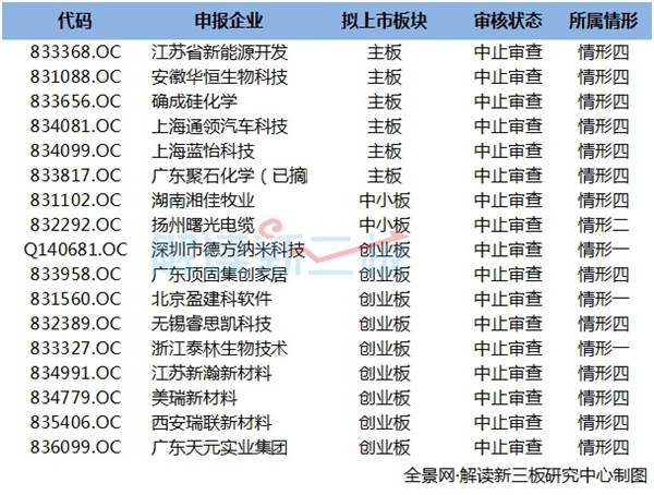 17家中止审查的挂牌企业中,泰林生物、盈建科因情形一中止,曙光电缆因情形二中止,其余14家均因情形四中止。