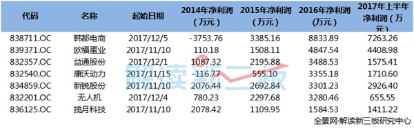 韩都电商业绩体量最大,2015年-2017年上半年分别实现归母净利润为3385.16万元、8833.89万元和7263.26万元。另外,欧福蛋业今年上半年归母净利润也超过3000万元,达到4408.98万元。