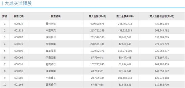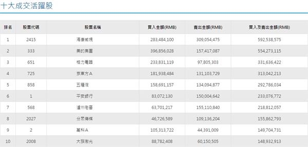 沪股通十大活跃股(来源:港交所)